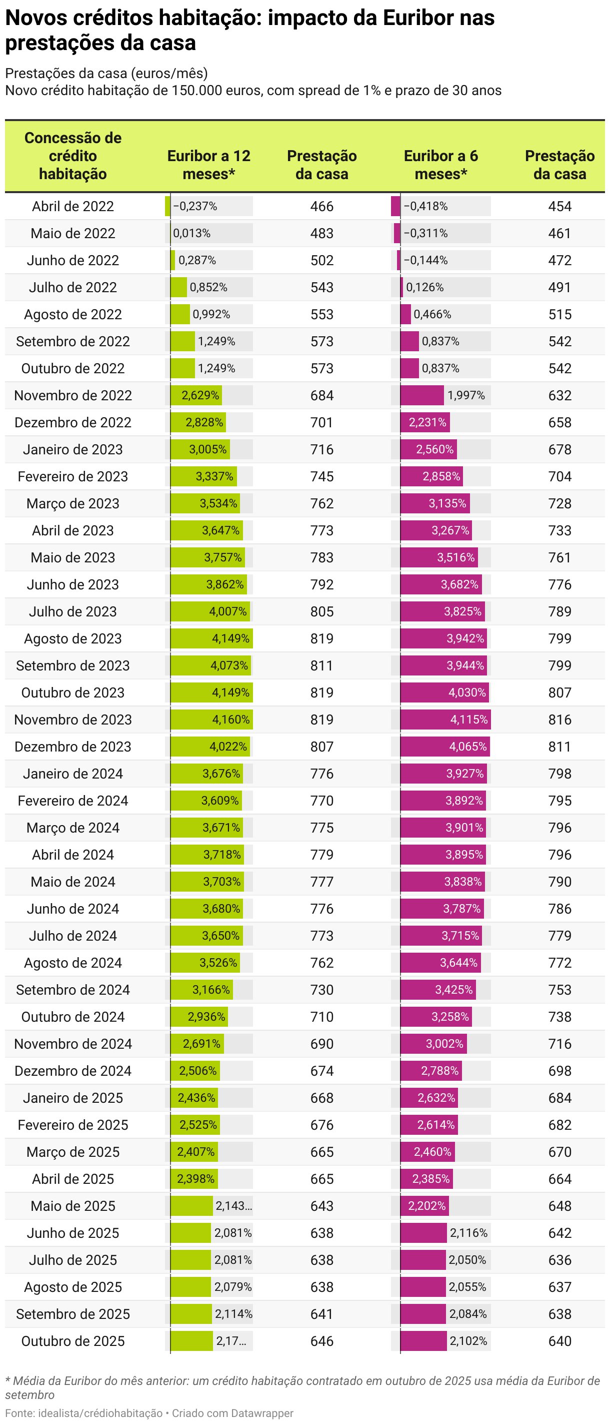 Esta ligeira subida da média mensal da Euribor em setembro acaba por impactar os novos créditos habitação contratados estes mês, verificando-se aumentos das prestações apenas apenas para os prazos mais longos. É isso que mostram as simulações do idealista/creditohabitaçao, que têm em conta um empréstimo da casa a taxa variável contratado em outubro (que usa a média mensal da Euribor de setembro) no valor de 150.000 euros, com spread 1% e prazo de 30 anos: